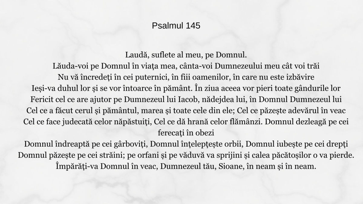 Laudă, suflete al meu, pe Domnul. Lăuda-voi pe Domnul în viaţa mea, cânta-voi Dumnezeului meu cât voi trăi Nu vă încredeţi în cei puternici, în fiii […]