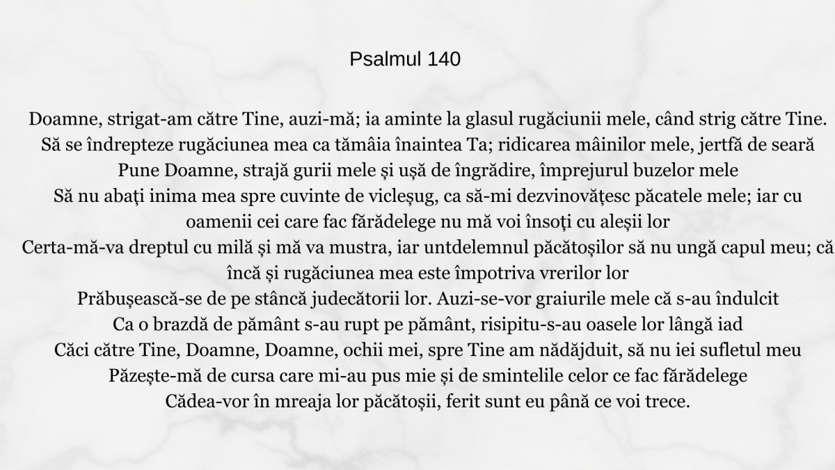 Doamne, strigat-am către Tine, auzi-mă; ia aminte la glasul rugăciunii mele, când strig către Tine. Să se îndrepteze rugăciunea mea ca tămâia înaintea Ta; ridicarea mâinilor […]