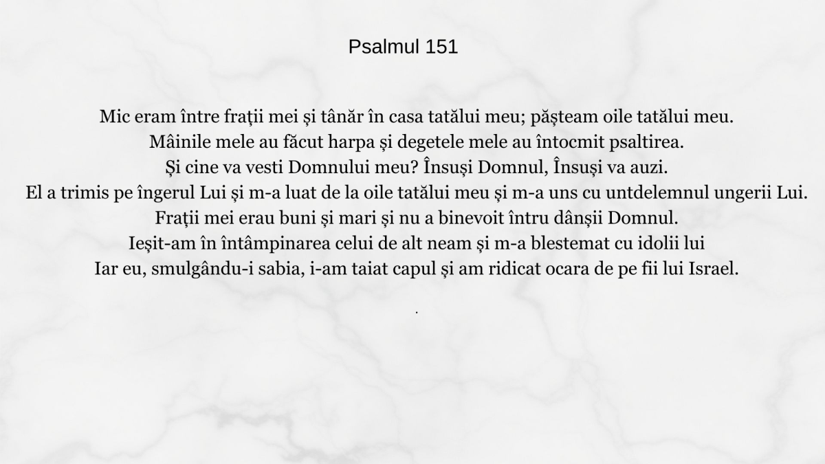 noiembrie 21, 2025Psalmul 151Mic eram între fraţii mei şi tânăr în casa tatălui meu; păşteam oile tatălui meu. Mâinile mele au făcut harpa şi degetele mele au întocmit psaltirea. […]